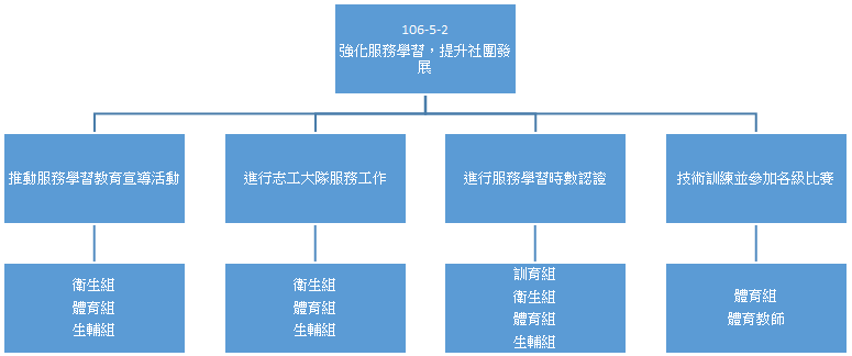 4.成立交通志工、糾察志工、春暉志工、環保小尖兵、體育活動裁判等志工團隊參加公益、慈善、環保、清潔及藝文活動之義工性質服務工作。